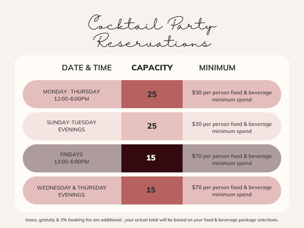 Our non-private cocktail parties take place alongside our regular service and reserve a designated section of the dining room. We offer the bar by consumption or with an open bar package and food stations.